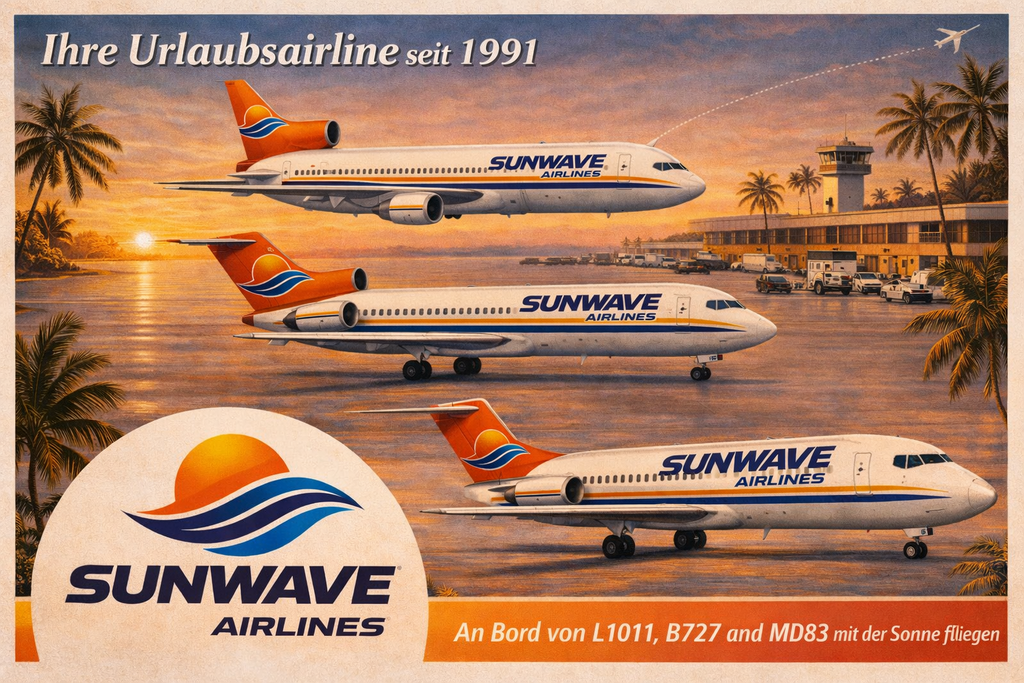 Die Sunwave Classic Livery ist unsere Hommage an eine Zeit, in der Flugzeuge Charakter hatten – und ihn auch zeigen durften. Inspiriert von den ikonischen Charter-Airlines der 80er und 90er Jahre, verbindet sie klare Linien mit warmen, vertrauten Farben und einer Präsenz, die man heute kaum noch findet.