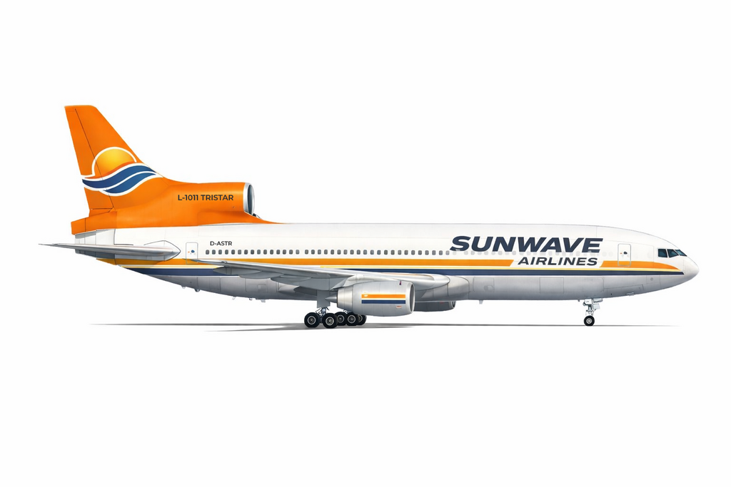 Klar, selbstbewusst, leicht retro – mit Anleihen an klassische Eurostile- und Airline-Schriften jener Zeit. Groß, lesbar, unverwechselbar. SUNWAVE steht nicht nur auf dem Rumpf – es gehört dorthin.